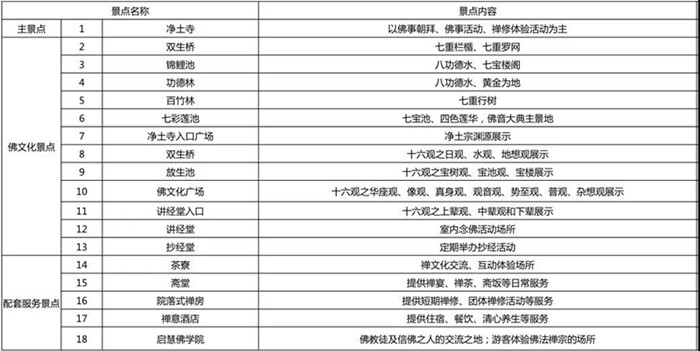 小镇依托项目区内目前已初步建成的净土寺,着力打造净土寺核心区、佛教培训区、泛佛事活动区、禅院区、游客服务区等几大主题功能区。通过净土宗佛事沿革和佛教典义物化展示体验,打造多条特色礼佛游线。在提供传统佛事活动的同时,通过讲经堂、抄经堂、斋堂等具有体验式、参与式的体验场所,在观览的基础上,能更深入的体验和感受佛文化。具有禅意的环境景观建设,在体现的里下河的水文化特色的基础上,再串接了功德林、500浮水罗汉、放生池、双生桥、百竹林等各类景点,进一步丰富小镇的整体环境,突出小镇的禅修特色。