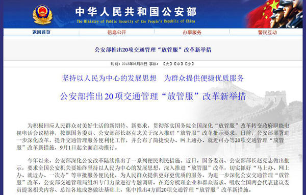 公安部交通管理局有关负责人表示,在7 月底前,资料减免、一证即办、自助快办等8 项便民服务类措施将在直辖市、省会市、自治区首府市和计划单列市等 36 个大城市率先落实,9 月1 日起,20 项措施全面启动推行。