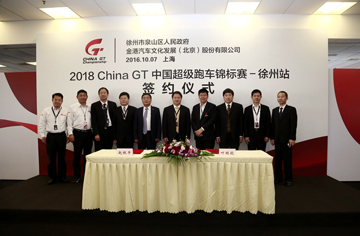| 2016年10月7日下午,“2018ChinaGT-徐州站”签约仪式在上海F1国际赛车场隆重举行,出席签约仪式的领导和嘉宾有:国家体育总局领导、徐州市副市长徐东海、泉山区委书记赵兴友、金港汽车文化发展(北京)股份有限公司总裁叶明钦、北京金港甲子汽车投资管理有限公司董事长姚建平、江苏永宁集团董事长卞绍春以及徐州市、泉山区、泉山经济开发区有关部门主要负责人。