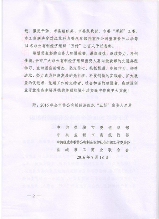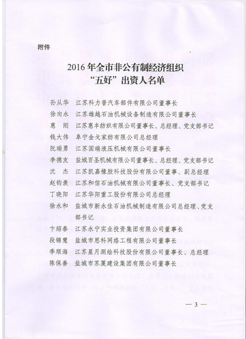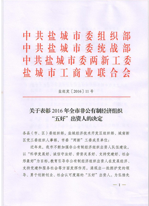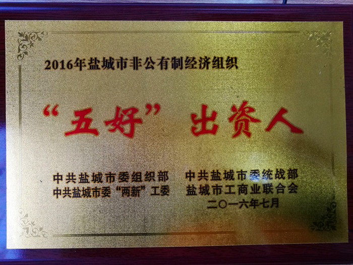 2016年7月18日,全市创业型党组织建设暨园区非公企业党建工作现场推进会在建湖召开,集团董事长卞绍春被表彰为2016年度盐城市“五好”出资人。