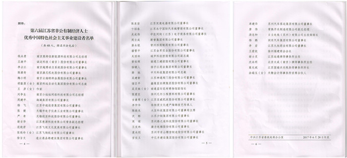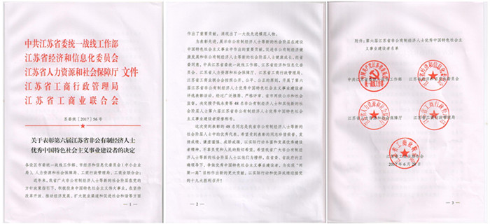 6月28日,由省委统战部、省经信委、省人社厅、省工商局和省工商联联合组织的第六届江苏省优秀中国特色社会主义事业建设者表彰大会在南京召开,省委书记、省人大常委会主任李强、省委副书记、代省长吴政隆、省政协主席蒋定之等出席表彰大会,集团董事长卞绍春受到表彰。