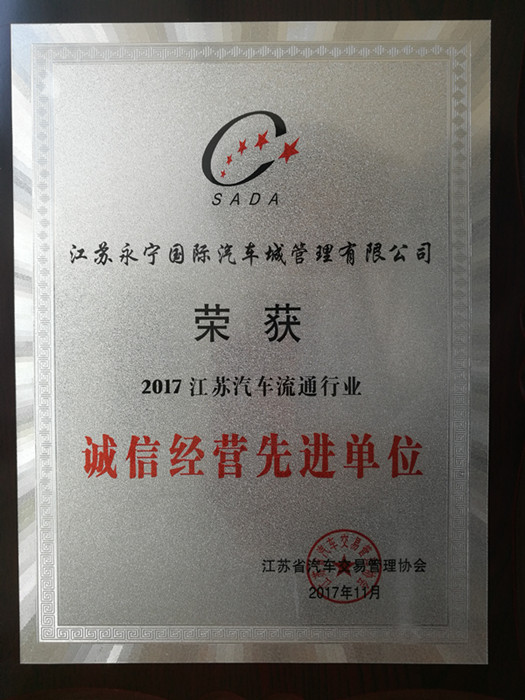 江苏永宁国际汽车城管理有限公司荣获2017江苏汽车流通行业诚信经营先进单位称号