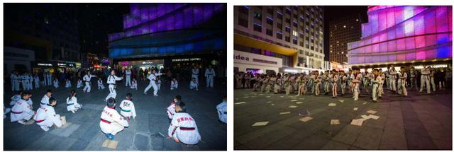 最为青春活力的当属一群穿着跆拳道服装的孩子们,帅气的造型,英俊的脸庞,专业的跆拳道武术,吸引了很多家长和青年们。寒冷的夜晚,并未让孩子们展现一丝丝的怯意,他们的专业表演点燃了这个城市,爆发出青春的力量。