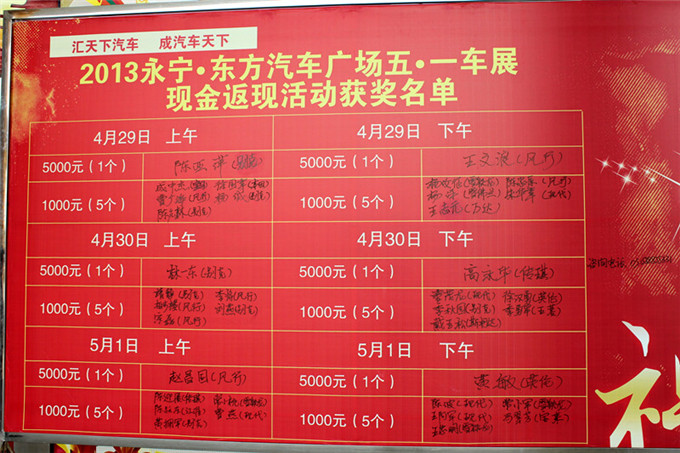 车展期间,现场成交量可观,永宁国际汽车城为回馈新老客户长期以来的支持,特别设立了买车送现金活动。在现场任意定车,即有机会参加抽奖,奖金设立五千元一名,一千元五名。一天抽取两次,历时三天,选票不计零,运气好的客户更可获得重复抽取机会,享受最直接的实惠。