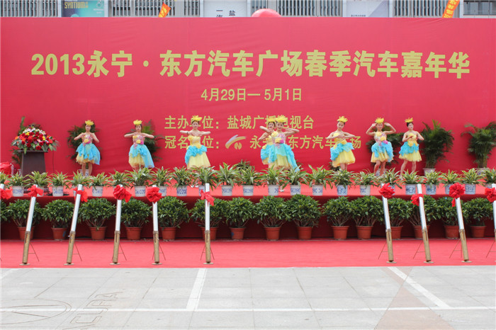 2013年4月29日上午,在永宁•东方汽车广场上,为期三天的2013永宁•东方汽车广场春季汽车嘉年华盛大开幕!此次汽车嘉年华由盐城电视台主办、中国东方汽车广场冠名,盐城电视台、盐城汽车网等媒体推广。为了确保汽车嘉年华真正达到让广大市民“五一”购好车的效果,主办方经过精心筹备,广泛论证,选择了国内外知名的汽车品牌参展,得到了众多品牌汽车经销商的积极响应。