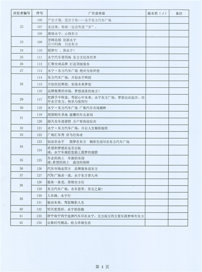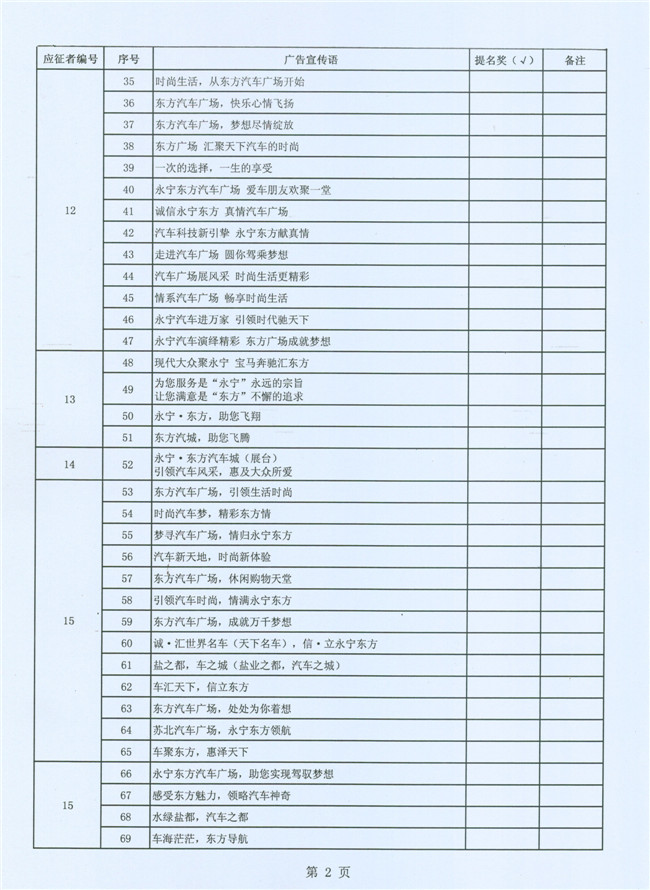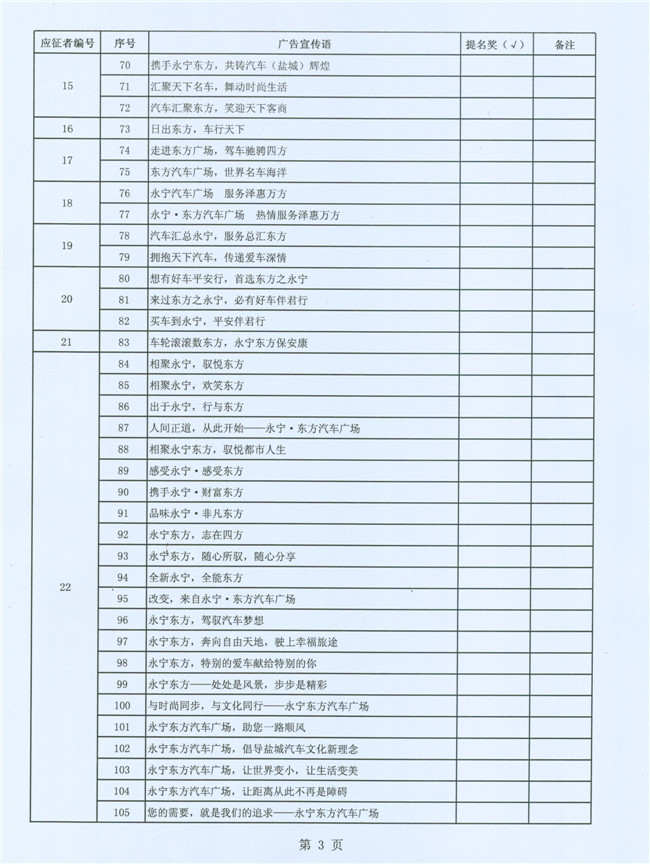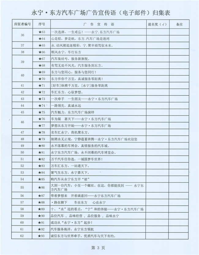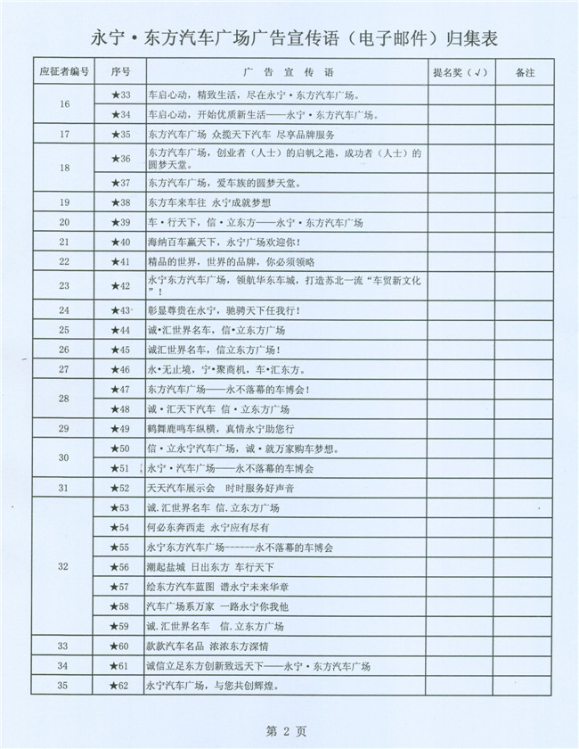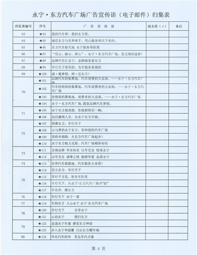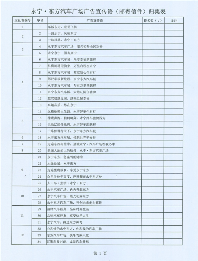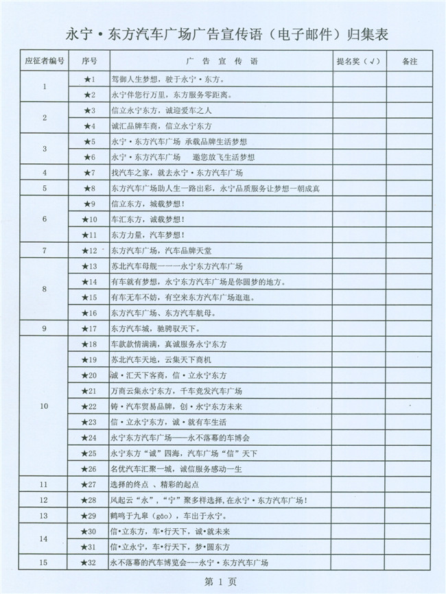 为了强化企业形象识别系统的建设,进一步提高永宁•东方汽车广场的品牌知名度,东方汽车广场建设指挥部联合永宁实业投资集团公开向社会有奖征集广告宣传语,计划通过评审的办法确定并最终固化一个认可度较高、含金量较大的广告宣传语加以推广传播。从8月12日(星期一)起先后在现代快报、盐城晚报以及盐城汽车网、鹤鸣亭、现代快报网等纸质传媒、网络传媒上公开有奖征集广场广告语。自8月13日至8月26日24:00,共收到有效电子邮件1683封、信函件75封,电子邮件投稿人835人、信函件投稿人77人,参与作品(电子邮件和信函件)总数达5947条,电子邮件含作品5430条、信函件含作品517条。得到了社会广泛反响和支持,有效的做了一次汽车广场宣传。经初步筛选,提交给评审组评审的宣传语为:电子邮件101人,共154条;信函件42人,共134条。
