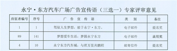 评委6:整个征集过程大家的积极性都很高,但是适用于我们永宁东方汽车广场“打造百亿级的销售额”、“打造苏北乃至华东地区最大的汽车集散地和汽车后市场”的角度,广告语没有一个合适的,可考虑融合在一起,糅合一下,所以保留意见。