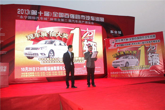 全国百强县市汽车巡展是中国展期最长、覆盖地域最广、现场售车数量最多的汽车展览会,已成为汽车企业在二、三级市场进行品牌推广、产品促销和文化传播的第一平台,被评为“改革开放三十年中国最具影响力汽车品牌活动”和“中国最具有公益性品牌活动”。本届汽车房产博览会由中国汽车报社、中国汽车新闻工作者协会、东台永宁国际汽车城、中国汽车报社市场信息咨询中心、北京东方艾狄尔会展有限公司、东台市广播电视台联合承办。专业的运营团队、多年办展经验,包括多家电视台、电台、报纸、网络媒体等在内的近十家媒体的大力支持,使得此次汽车房产博览会的规格、规模、档次都上升到一个新的台阶。
